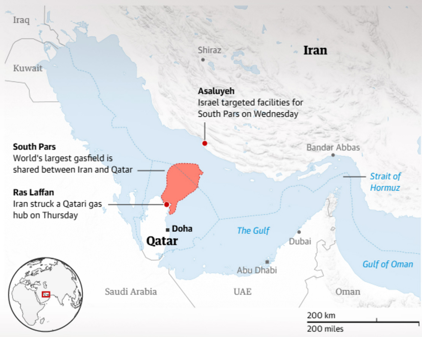 Η Τεχεράνη, ως απάντηση στο χτύπημα που δέχτηκε, επιτέθηκε στο Ras Laffan, τον χώρο των βασικών εγκαταστάσεων επεξεργασίας υγροποιημένου φυσικού αερίου (LNG) του Κατάρ, προκαλώντας «εκτεταμένες ζημιές» στους μεγαλύτερους προμηθευτές θαλάσσιων φορτίων φυσικού αερίου στον κόσμο.