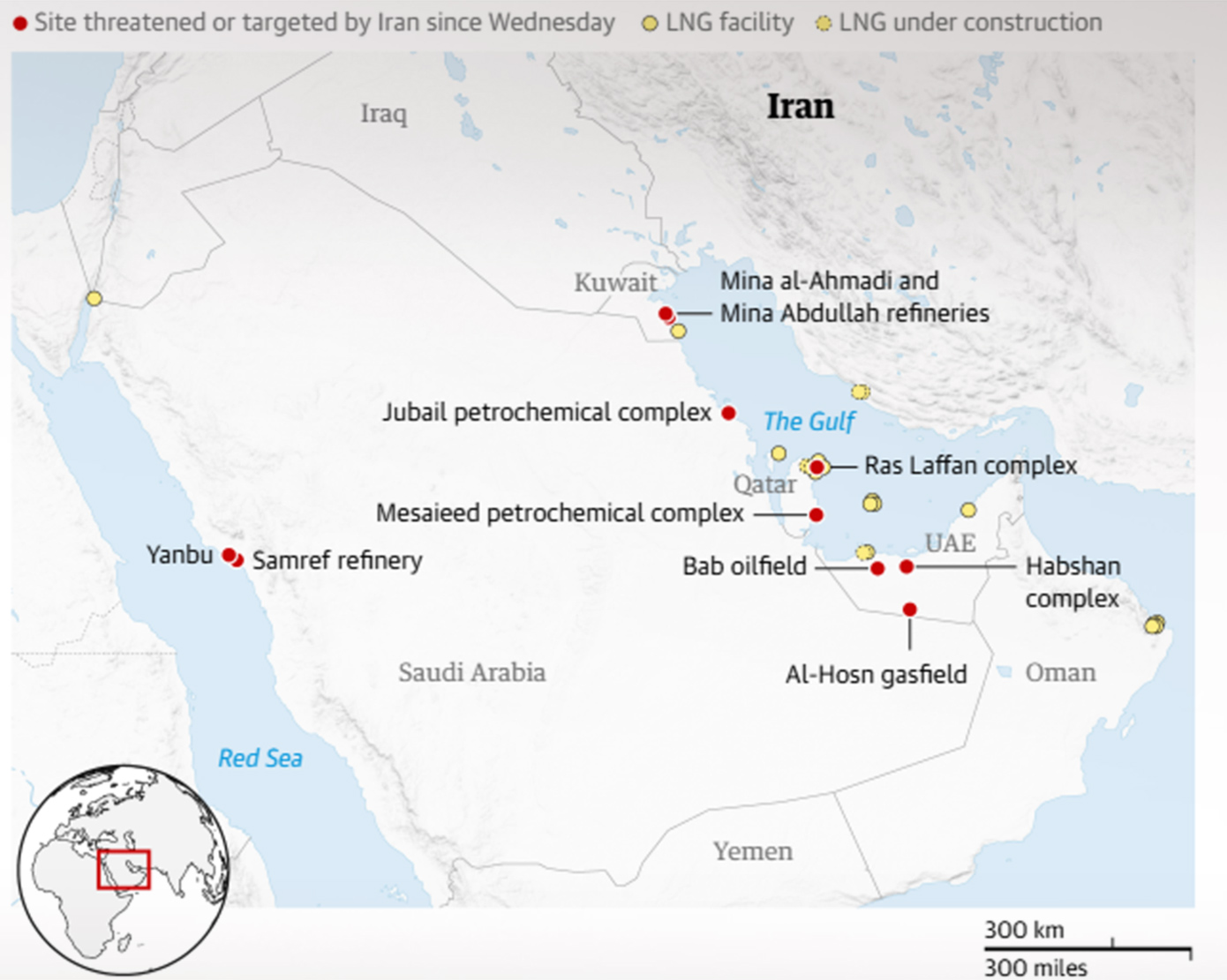 Εν τω μεταξύ, στο συγκρότημα Habshan των ΗΑΕ, μία από τις μεγαλύτερες εγκαταστάσεις επεξεργασίας φυσικού αερίου στον κόσμο, θραύσματα από αναχαιτισμένους πυραύλους προκάλεσαν την προσωρινή διακοπή λειτουργίας της μονάδας, σύμφωνα με την κρατική εταιρεία πετρελαίου και φυσικού αερίου Adnoc. Η εταιρεία ανέφερε επίσης ότι επλήγη και το πεδίο πετρελαίου Bab.