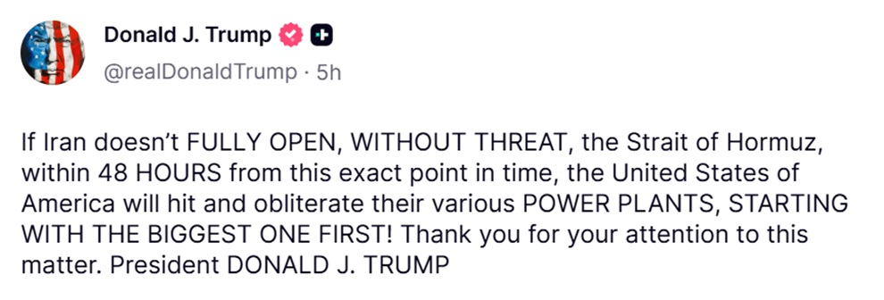 Η Τεχεράνη αντέδρασε άμεσα στο τελεσίγραφο που έθεσε ο Αμερικανός πρόεδρος, ο οποίος απαίτησε το άνοιγμα του Στενού του Χορμούζ εντός 48 ωρών, διαφορετικά προειδοποίησε με καταστροφικά πλήγματα σε κρίσιμες ενεργειακές υποδομές του Ιράν. Σε απάντηση, το Ιράν απείλησε ότι θα στοχοποιήσει βασικές εγκαταστάσεις στη Μέση Ανατολή.