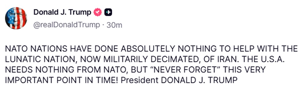 Στη νέα του τοποθέτηση, ο Ντόναλντ Τραμπ ισχυρίστηκε ότι τα κράτη-μέλη του ΝΑΤΟ δεν έχουν προσφέρει καμία ουσιαστική βοήθεια στις αμερικανικές προσπάθειες έναντι του Ιράν, υπογραμμίζοντας χαρακτηριστικά ότι δεν έχουν κάνει «ΑΠΟΛΥΤΩΣ ΤΙΠΟΤΑ». Η δήλωση αυτή συνοδεύτηκε από μια σαφή προειδοποίηση προς τη Συμμαχία, καθώς πρόσθεσε ότι οι Ηνωμένες Πολιτείες δεν έχουν ανάγκη από το ΝΑΤΟ, αλλά θα πρέπει να «ΜΗΝ ΤΟ ΞΕΧΑΣΟΥΝ ΠΟΤΕ».