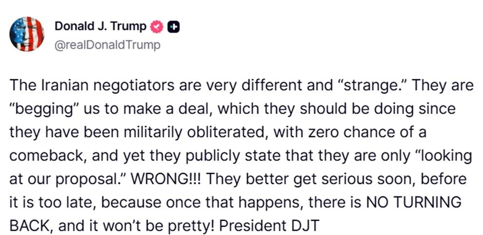 Στο ίδιο μήκος κύματος κινήθηκε και σε νεότερη ανάρτησή του, στην οποία ο Ντόναλντ Τραμπ αναφέρθηκε απευθείας στις διαπραγματεύσεις με το Ιράν, χρησιμοποιώντας ιδιαίτερα σκληρή γλώσσα για τους Ιρανούς διαπραγματευτές. Συγκεκριμένα, έγραψε: «Οι Ιρανοί διαπραγματευτές είναι πολύ διαφορετικοί και “παράξενοι”. Μας “ικετεύουν” να κάνουμε μια συμφωνία, κάτι που θα έπρεπε να κάνουν αυτοί, αφού έχουν συντριβεί στρατιωτικά, χωρίς καμία πιθανότητα επιστροφής, και παρ’ όλα αυτά δηλώνουν δημόσια ότι απλώς “εξετάζουν την πρότασή μας”. ΛΑΘΟΣ!!! Καλύτερα να σοβαρευτούν σύντομα, πριν να είναι πολύ αργά, γιατί όταν συμβεί αυτό, ΔΕΝ ΥΠΑΡΧΕΙ ΕΠΙΣΤΡΟΦΗ και δεν θα είναι καθόλου όμορφο!».