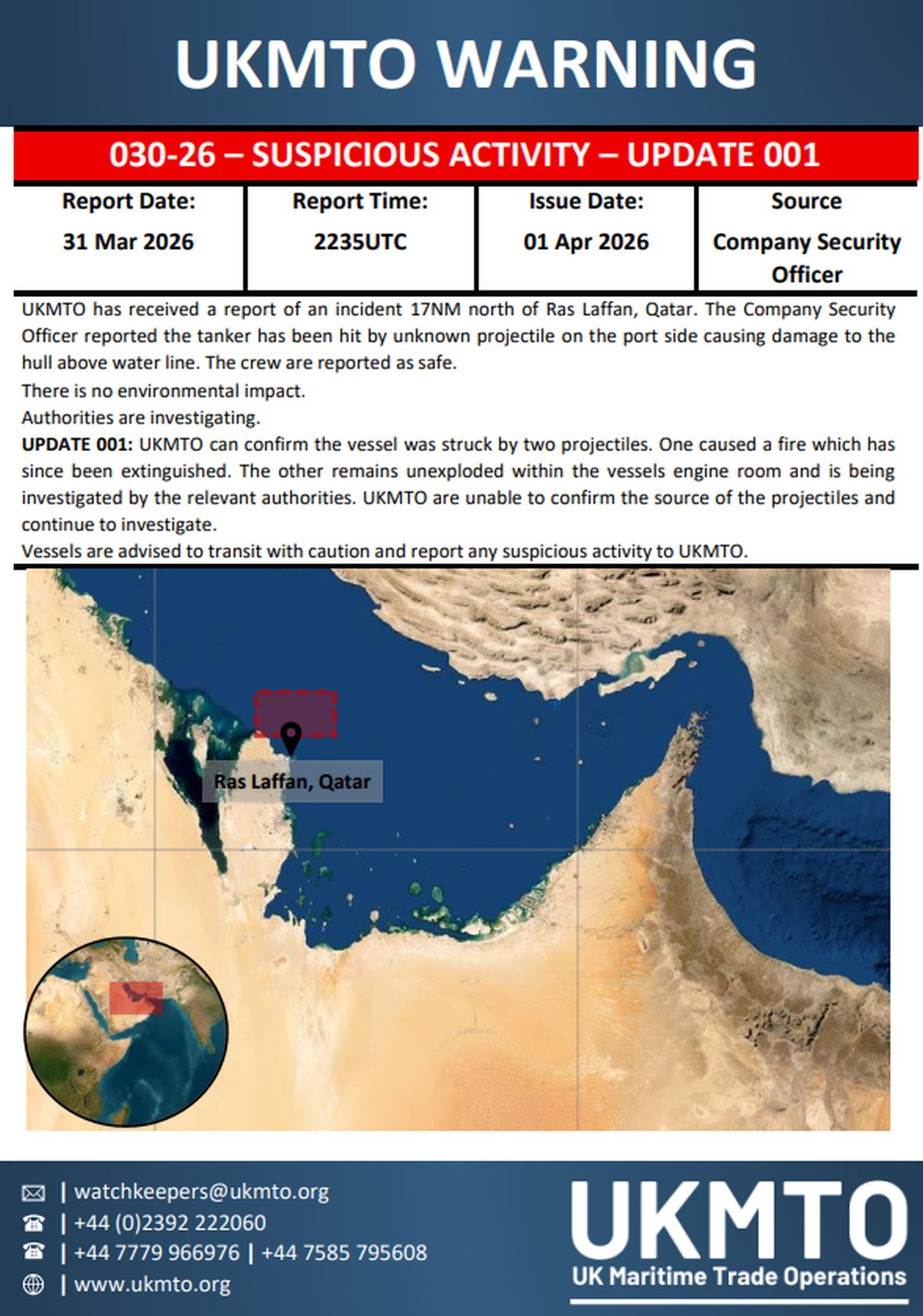«Άγνωστο βλήμα» χτύπησε δεξαμενόπλοιο στον θαλάσσιο χώρο περίπου 17 ναυτικά μίλια (περίπου 30 χιλιόμετρα) βόρεια από την Ντόχα, την πρωτεύουσα του Κατάρ, ανακοίνωσε τις πρώτες πρωινές ώρες η υπηρεσία ασφάλειας της ναυσιπλοΐας UKMTO, που υπάγεται στο βρετανικό υπουργείο Άμυνας, επικαλούμενη αναφορά του πλοιάρχου.