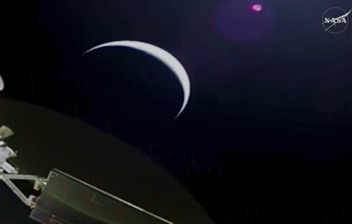 Η δεύτερη εικόνα παρουσιάζει τη Γη ως μια «γαλάζια κουκκίδα», όπως την αντικρίζει το πλήρωμα καθώς απομακρύνεται, ενισχύοντας την αίσθηση του απέραντου διαστήματος και της μικρότητας του πλανήτη μας.