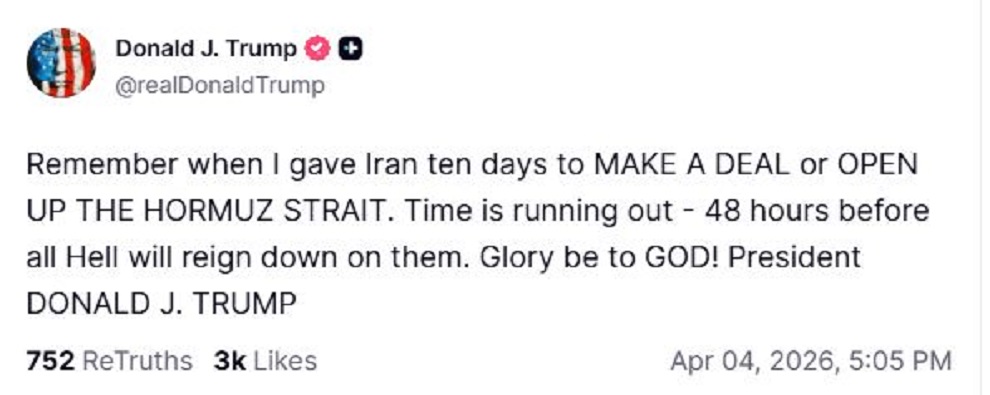 «Θυμάστε όταν έδωσα στο Ιράν δέκα ημέρες για να ΚΛΕΙΣΕΙ ΣΥΜΦΩΝΙΑ ή να ΑΝΟΙΞΕΙ ΤΑ ΣΤΕΝΑ ΤΟΥ ΟΡΜΟΥΖ; Ο χρόνος τελειώνει – 48 ώρες πριν ξεσπάσει η κόλαση πάνω τους. Δόξα στον ΘΕΟ!».
