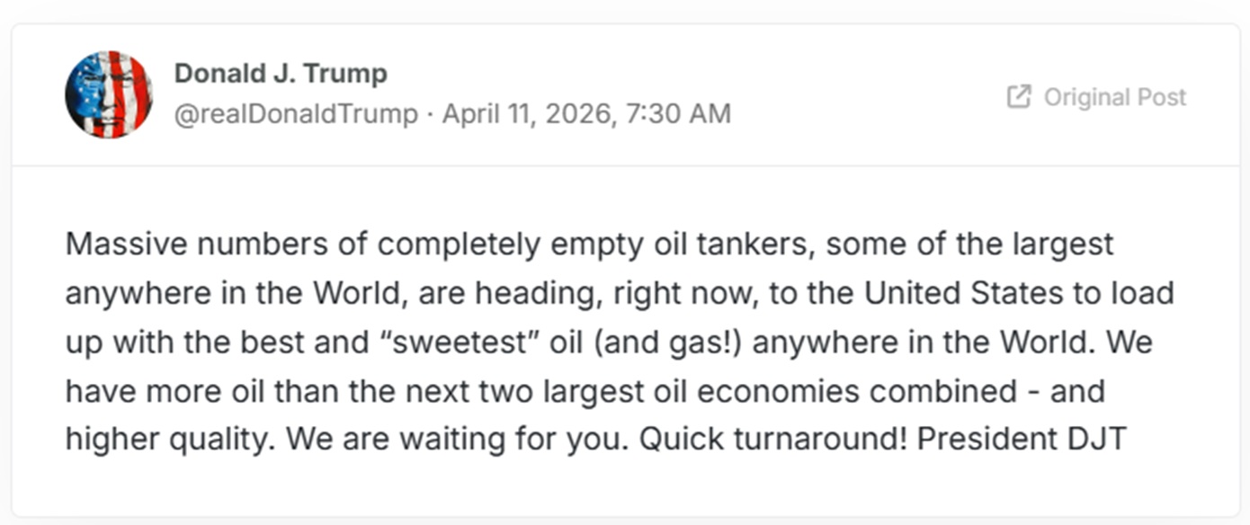 «Τεράστιος αριθμός εντελώς άδειων πετρελαιοφόρων κατευθύνεται αυτή τη στιγμή προς τις ΗΠΑ για να φορτώσει το καλύτερο και πιο ποιοτικό πετρέλαιο και φυσικό αέριο που υπάρχει στον κόσμο» έγραψε. «Έχουμε περισσότερο πετρέλαιο από τις δύο επόμενες μεγαλύτερες πετρελαϊκές οικονομίες μαζί, και μάλιστα ανώτερης ποιότητας. Σας περιμένουμε!»
