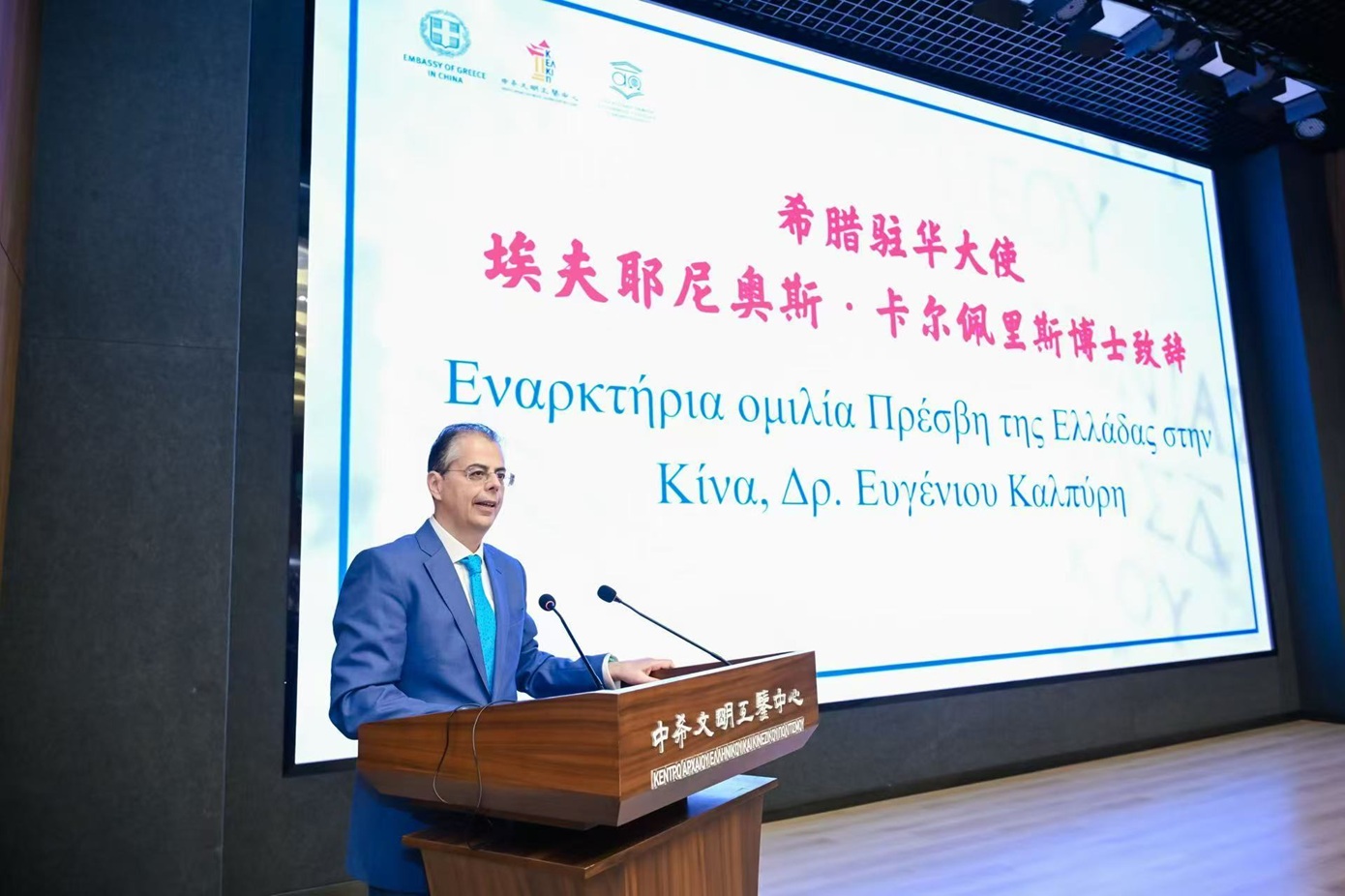 Στην εναρκτήρια ομιλία του, ο πρέσβης της Ελλάδας στην Κίνα, Δρ. Ευγένιος Καλπύρης, ανέτρεξε στην ιστορία σαράντα αιώνων της ελληνικής γλώσσας, αναδεικνύοντας «τη σημασία της ελληνικής γλώσσας ως παγκόσμιου δημόσιου αγαθού και τον αναμφισβήτητο δυναμισμό του ελληνικού γλωσσικού φαινομένου».