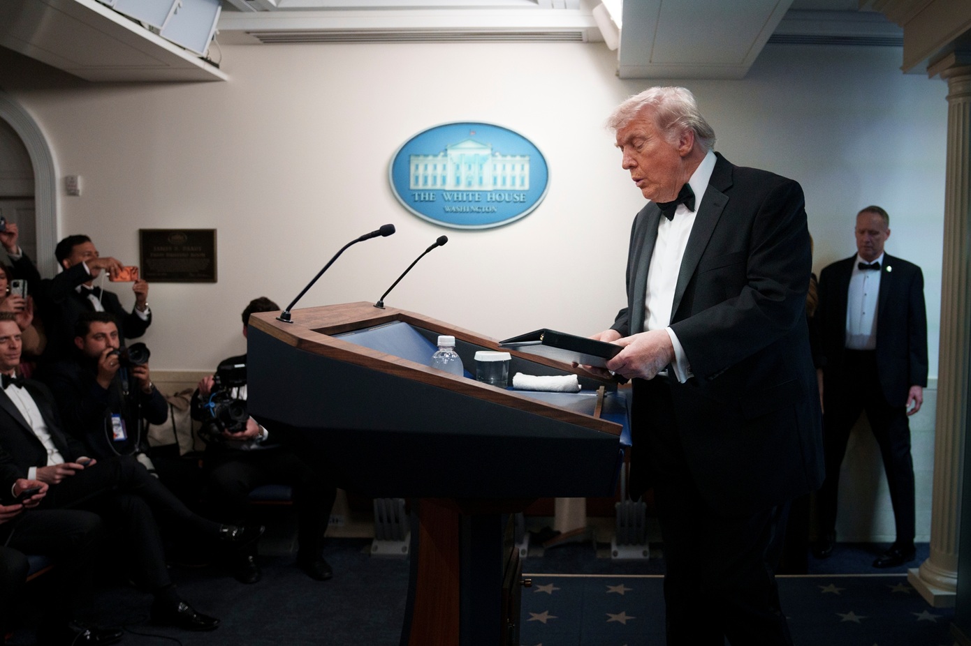 Τραμπ ενημέρωσε το βράδυ του Σαββάτου (τοπική ώρα) ότι μέλος των δυνάμεων επιβολής της τάξης τραυματίστηκε όταν ανταλλάχθηκαν πυρά με ύποπτο, ο οποίος τέθηκε υπό κράτηση έξω από τον χώρο όπου παρέθετε το ετήσιο δείπνο της η ένωση ανταποκριτών Λευκού Οίκου (WHCA), σε γνωστό ξενοδοχείο στην πρωτεύουσα των ΗΠΑ.