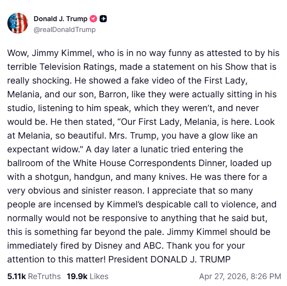 «Εκτιμώ ότι πολλοί άνθρωποι έχουν εξοργιστεί από την απεχθή προτροπή σε βία του Κίμελ και, κανονικά, δεν θα αντιδρούσα σε οτιδήποτε λέει, αλλά αυτό ξεπερνά κάθε όριο. Ο Τζίμι Κίμελ πρέπει να απολυθεί άμεσα από τη Disney και το ABC. Σας ευχαριστώ για την προσοχή σας στο θέμα αυτό! Πρόεδρος ΝΤΟΝΑΛΝΤ ΤΖ. ΤΡΑΜΠ».