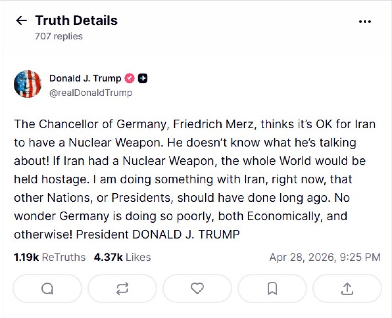 Η αντίδραση Τραμπ ήρθε μετά τις δηλώσεις του Φρίντριχ Μερτς, ο οποίος υποστήριξε ότι η ιρανική ηγεσία «ταπεινώνει» τις Ηνωμένες Πολιτείες στη συνεχιζόμενη κρίση.