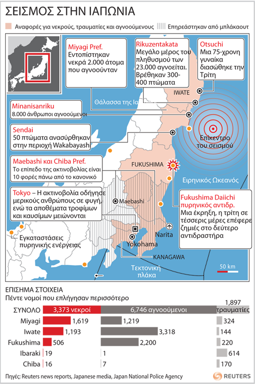 Ο τελευταίος επίσημος απολογισμός από τις ιαπωνικές αρχές έκανε λόγο για 3.373 επιβεβαιωμένους θανάτους και τουλάχιστον 7.558 αγνοούμενους. Εν τω μεταξύ έντονες ανησυχίες εκφράζονται για τα πυρηνικά ατυχήματα που προκλήθηκαν από το σεισμό μεγέθους 9 Ρίχτερ και τη βλάβη στον πυρήνα του αντιδραστήρα 2 στον πυρηνικό σταθμό της Φουκουσίμα.