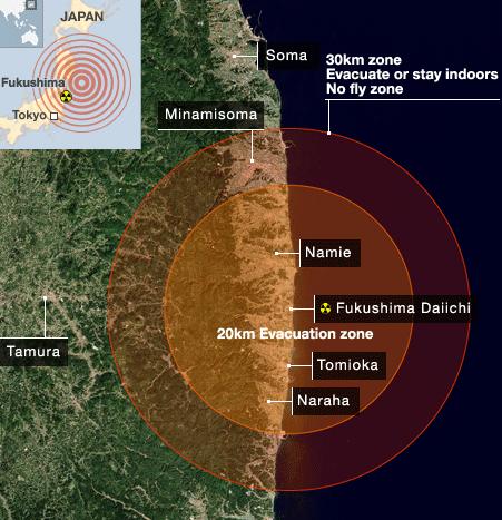 Ακολουθεί η απεικόνιση των ζωνών για τις οποίες έχει εκδοθεί προειδοποίηση γύρω από το πυρηνικό εργοστάσιο της Φουκουσίμα
