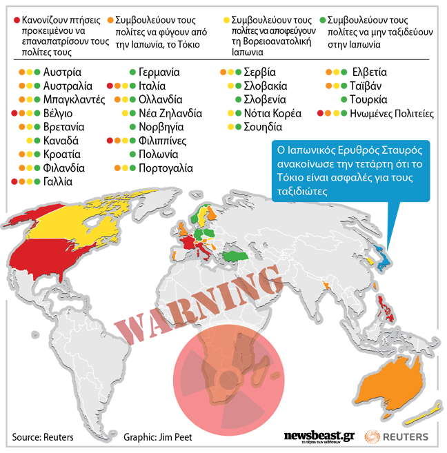 Πολλές χώρες έχουν ήδη εκδώσει ταξιδιωτικές οδηγίες προς τους πολίτες τους που σκοπεύουν να επισκεφθούν την Ιαπωνία, συμβουλεύοντας τους είτε να μην πάνε καθόλου είτε τουλάχιστον να αποφύγουν τις περιοχές που βρίσκονται στα βορειοανατολικά της χώρας, μετά από τις σοβαρές ζημιές που υπέστη ο πυρηνικός σταθμός της Φουκουσίμα, μετά τον καταστροφικό σεισμό των 9 Ρίχτερ που «χτύπησε» την περιοχή.