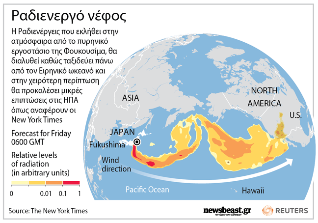 Ακόμη και αν λάβουμε υπ’ όψιν το πιο αισιόδοξο σενάριο ελπίζοντας ότι θα ελεγχθεί άμεσα η διαρροή ραδιενέργειας από το εργοστάσιο της Φουκουσίμα στην Ιαπωνία, είναι σημαντικό να δούμε βάσει καιρικών συνθηκών προς τα πού θα κατευθυνθεί η ραδιενέργεια που έχει ήδη εκλυθεί και πώς θα διαλυθεί.