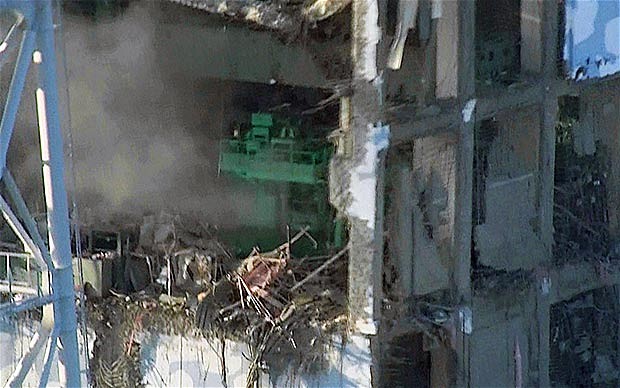 Ανοιχτή στα στοιχεία της φύσης, μετά την ανατίναξη των προστατευτικών της τοιχωμάτων(πράσινο χρώμα), η στεγνή πλέον από νερό «πισίνα» αποθήκευσης των χρησιμοποιημένων ράβδων ουρανίου του αντιδραστήρα 4, απειλεί την Ιαπωνία, αλλά και ολόκληρο των πλανήτη με θανατηφόρες δόσεις ραδιενέργειας, σε περίπτωση πιθανής πυρηνικής τήξης.