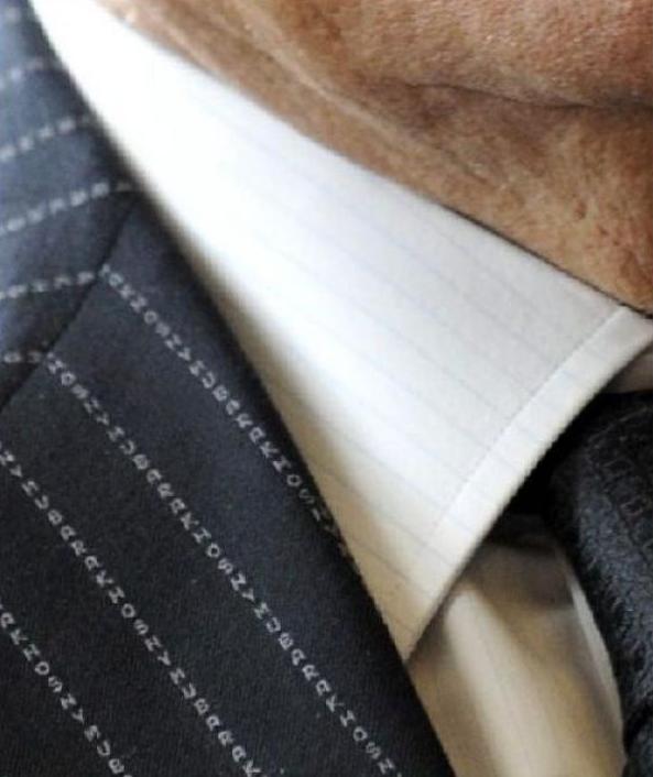 Κοιτώντας όμως πιο προσεκτικά, θα διακρίνετε ότι αυτό το κοστούμι… έχει υπογραφή, καθώς οι ρίγες του αποτελούνται από μικροσκοπικά γράμματα που σχηματίζουν το όνομά του.