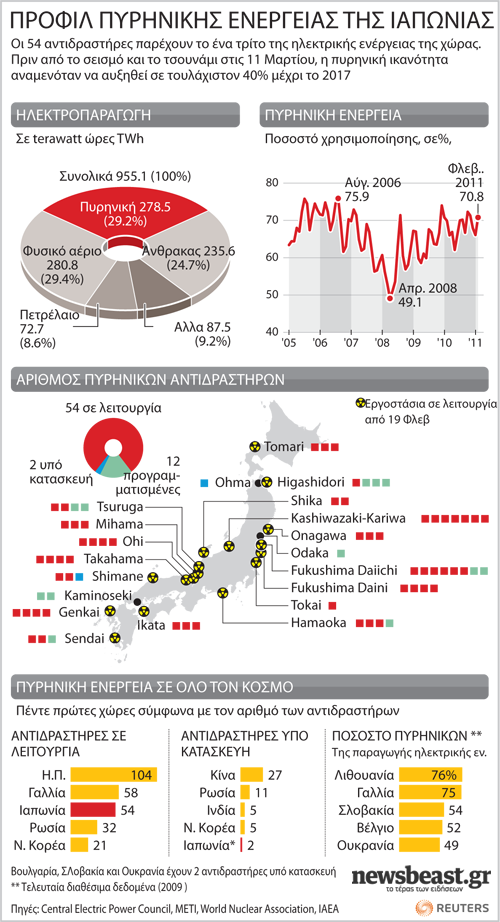 Ιδιαιτέρως αποκαλυπτικά στοιχεία περιέχει γράφημα του ειδησεογραφικού πρακτορείου Reuters με την τοποθεσία των 54 πυρηνικών αντιδραστήρων που λειτουργούν στην Ιαπωνία, αλλά και με τις υπόλοιπες χώρες του πλανήτη που διαθέτουν δεκάδες εργοστάσια.