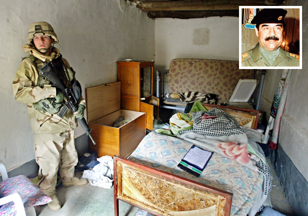 Οι αμερικανικές δυνάμεις εντόπισαν τον Saddam Hussein τον Δεκέμβριο του 2003, κρυμμένο σε ένα λαγούμι, όπου μετά βίας χωρούσε ένα άτομα, κοντά στη γενέτειρά του, Tikrit.