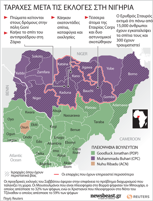 Ο κύριος υποψήφιος της αντιπολίτευσης στρατηγός Μπουχάρι, Μουσουλμάνος από το Βορρά, έλαβε το 31% των ψήφων στις προεδρικές εκλογές και ήρθε δεύτερος μετά τον απερχόμενο πρόεδρο Γκούντλακ Τζόναθαν, 53χρονο Χριστιανό του Νότου, όπου βρίσκονται τα πετρελαϊκά κοιτάσματα της χώρας. Ο νικητής των εκλογών του Σαββάτου έλαβε το 57% των ψήφων, σύμφωνα με την εκλογική επιτροπή.