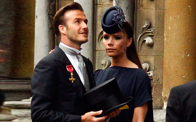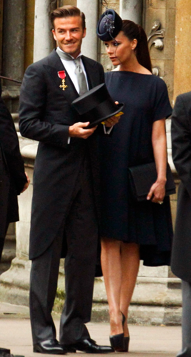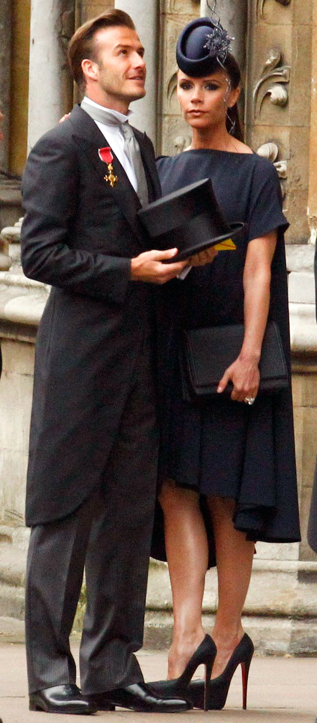 Κομψοί και λαμπεροί και οι δύο, όπως μας έχουν συνηθίσει άλλωστε, έφτασαν στην ώρα τους για τη γαμήλια τελετή ο Ντέιβιντ και η Βικτόρια Μπέκαμ. Σύμφωνα με το γαμήλιο dress code η Βικτόρια φορά ένα εντυπωσιακό καπέλο και παρά την προχωρημένη εγκυμοσύνη της ισορροπεί – μάλλον συνηθισμένο και αυτό- πάνω σε ένα ζευγάρι πανύψηλές γόβες.