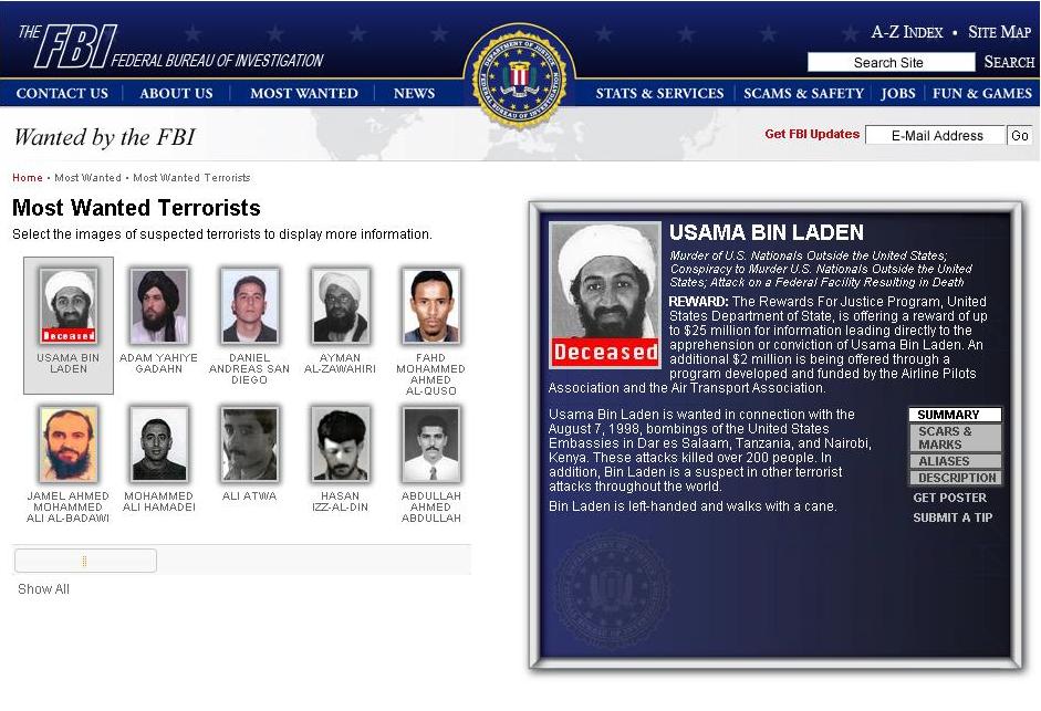 Εν τω μεταξύ στην ιστοσελίδα του FBI,η λίστα των πιο καταζητούμενων τρομοκρατών έχει ήδη ανανεωθεί… Ένας λιγότερος για τους Αμερικανούς, οι οποίοι τόνισαν με μεγάλα κόκκινα γράμματα τη λέξη «πεθαμένος».