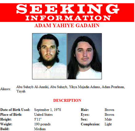 Ο Gadahn έχει γεννηθεί στο Oregon των ΗΠΑ και στα τέλη της δεκαετίας του ’90 εγκαταστάθηκε στο Πακιστάν. Σύμφωνα με το FBI έχει προσφέρει υλική υποστήριξη στην αλ Κάιντα.