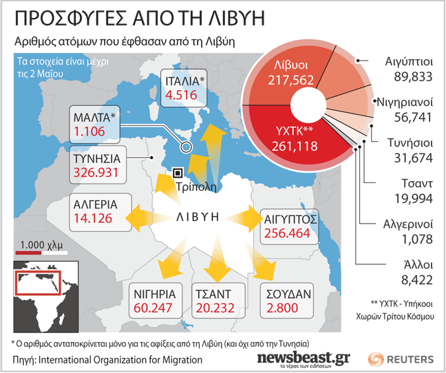Τους περισσότερους πρόσφυγες μέχρι τις 2 Μαΐου έχει δεχτεί η Τυνησία με τον αριθμό να αγγίζει τις 326.931 και ακολουθεί η Αίγυπτος, η Νιγηρία, η Αλγερία, το Τσαντ, η Ιταλία, το Σουδάν και η Μάλτα.