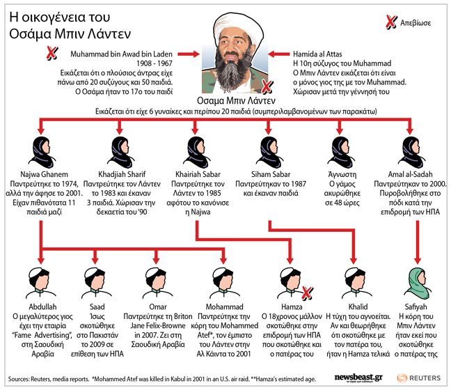 Εικάζεται ότι ο Οσάμα Μπιν Λάντεν είχε παντρευτεί έξι γυναίκες, με τις οποίες έκανε πιθανότατα είκοσι παιδιά. Ο αρχηγός της Αλ Κάιντα ήταν το 17ο από τα 50 του Muhammad bin Awad bin Laden. Στο γράφημα του Reuters παρουσιάζεται αναλυτικά η οικογένεια του Λάντεν.