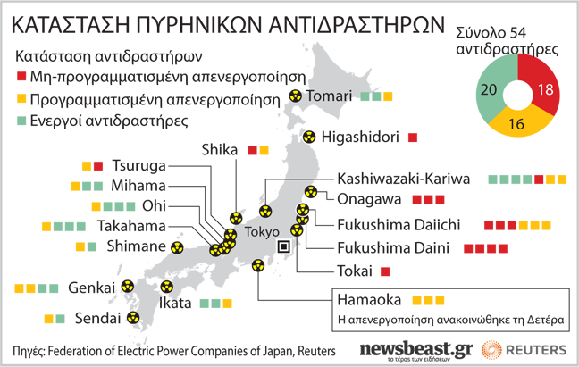Σε σύνολο 54 πυρηνικών αντιδραστήρων σε ολόκληρη τη χώρα, η ιαπωνική κυβέρνηση έχει ήδη προγραμματίσει το κλείσιμο αρκετών εξ αυτών, ενώ εκκρεμεί το μέλλον πολλών άλλων.