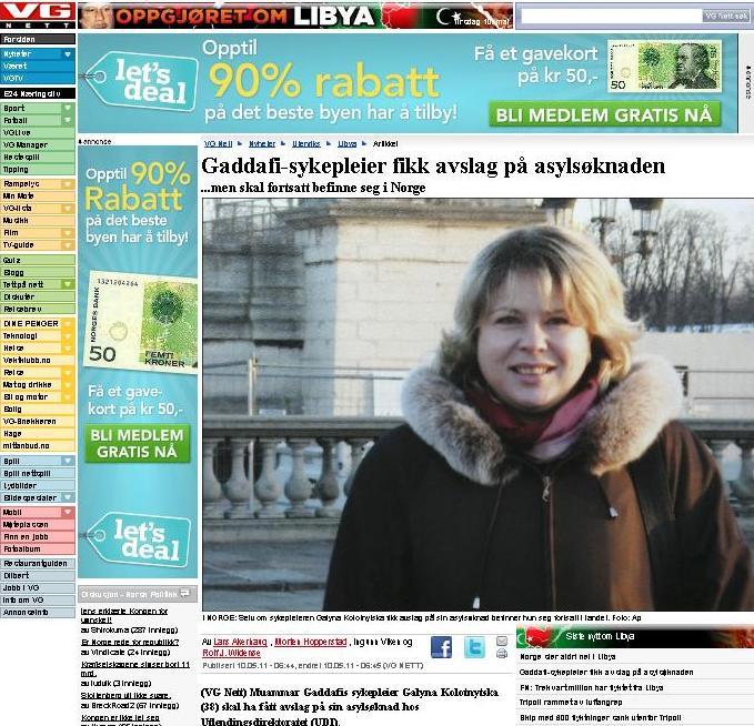 Σύμφωνα με την ταμπλόιντ, η οποία επικαλείται πολλές πηγές, τις οποίες δεν κατονομάζει, οι νορβηγικές αρχές που είναι αρμόδιες για θέματα μετανάστευσης απέρριψαν την αίτηση χορήγησης ασύλου της πρώην νοσοκόμας του Καντάφι, αλλά η 38χρονη από την Ουκρανία εξακολουθεί να βρίσκεται στη χώρα.