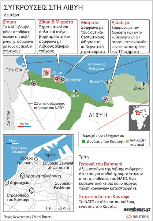 Δεν έχει τέλος η κρίση στη Λιβύη, με τις μάχες να βρίσκονται σε πλήρη εξέλιξη σε όλα τα μέτωπα, ενώ το ΝΑΤΟ βομβαρδίζει ανηλεώς τις κυβερνητικές αποθήκες πυρομαχικών.