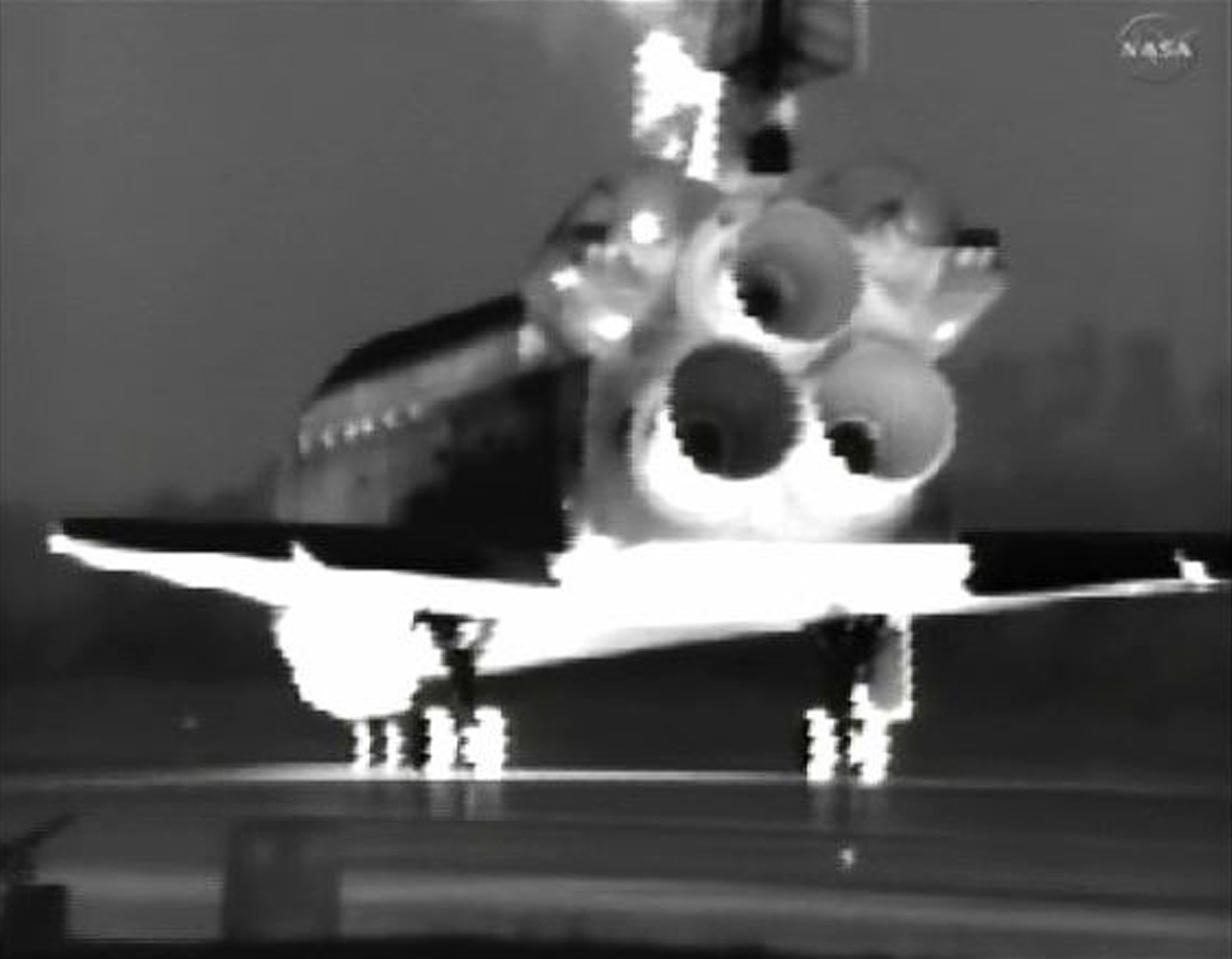 Πετώντας μέσα στο νυχτερινό ουρανό το σκάφος με 6μελές πλήρωμα έφτασε στο Διαστημικό Κέντρο Κέννεντι κάνοντας κύκλους από πάνω του για να μειώσει ταχύτητα και εκπέμποντας ένα ειδικό ηχητικό σήμα για να σηματοδοτήσει την επιστροφή του.