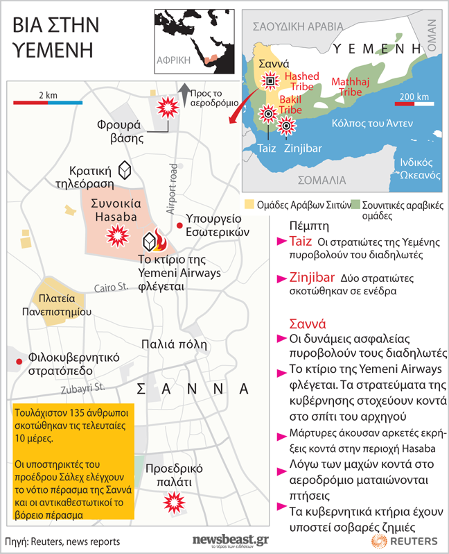 Δεκάδες είναι και σήμερα οι νεκροί στην Υεμένη ανάμεσα στις δυνάμεις του προέδρου, Αλί Αμπντουλάχ Σάλεχ, και των εξεγερμένων που εδώ και εβδομάδες ζητούν την άμεση αποχώρησή του.