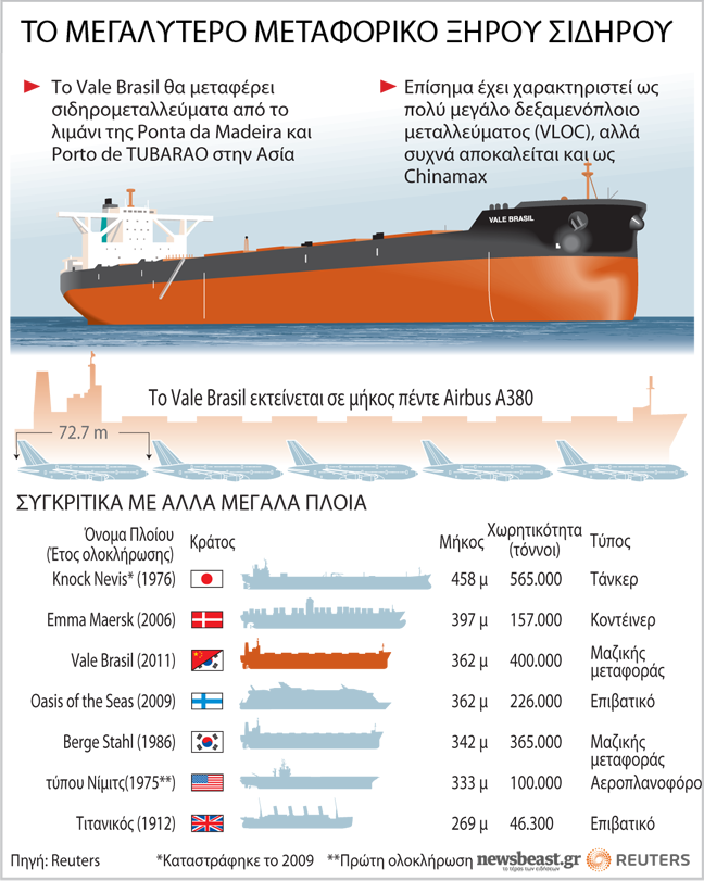 Με το χτίσιμο ενός πλοίου ξηρού φορτίου 400.000 τόνων, η κολοσσιαία Βραζιλιάνικη εταιρεία μεταλλευμάτων, Vale, έσπασε ένα ρεκόρ που κρατούσε 25 χρόνια για την κατασκευή του μεγαλύτερου φορτηγού-πλοίου στον κόσμο.