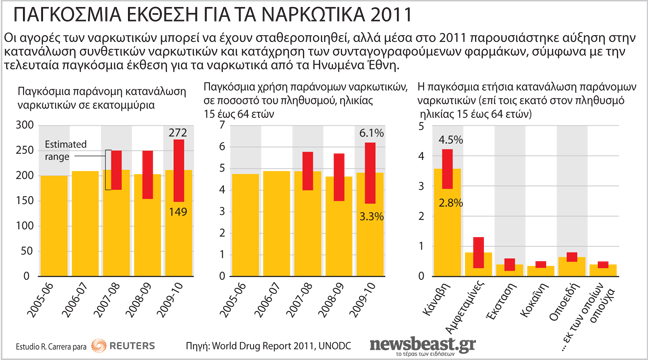 Η τελευταία παγκόσμια έκθεση για τα ναρκωτικά των Ηνωμένων Εθνών για το 2011 έδειξε ότι οι αγορές των ναρκωτικών σταθεροποιήθηκαν, αλλά παρουσιάστηκε αύξηση στην κατανάλωση συνθετικών ναρκωτικών και κατάχρηση των συνταγογραφούμενων φαρμάκων.