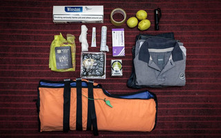 Από αριστερά: 1 Ένα κουτί τσιγάρα Winston, 2 μια κίτρινη πλαστική σακούλα για τα έγγραφά του, 3 ταινία για να κλείσει την πλαστική σακούλα για να μη μπει νερό 4 λεμόνια για τη ναυτία, 5 στυλό- λέιζερ για να προσελκύσει τα διερχόμενα σκάφη σε περίπτωση ναυαγίου, 6 επίδεσμοι, 7 δημόσια έγγραφα 8 αντηλιακό, 9 παυσίπονα, 10 μια αλλαξιά ρούχα, 11 σωσίβιο
