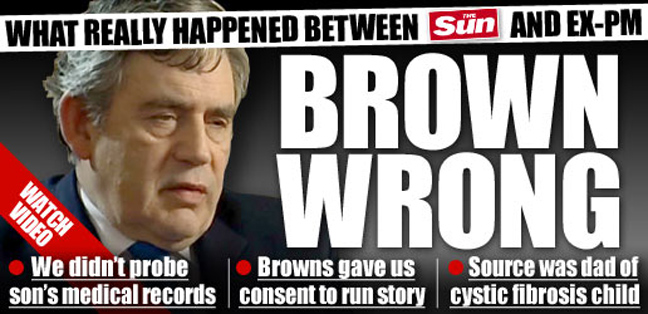 «Ο Μπράουν κάνει λάθος». Με αυτόν τον πηχυαίο πρωτοσέλιδο τίτλο, η βρετανική εφημερίδα Sun αποκρούει τις κατηγορίες που τη θέλουν να έχει αποκτήσει παράνομα στοιχεία από τον ιατρικό φάκελο του γιου του πρώην πρωθυπουργού της χώρας.