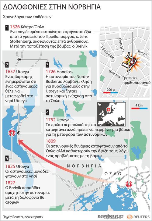 Στη μία και μισή έγινε η έκρηξη έξω από τα γραφεία της κυβέρνησης, ενώ μιάμιση ώρα μετά ξεκίνησε η σφαγή στο νησί Ουτόγια που είχε ως αποτέλεσμα και τους περισσότςερους θανάτους από το διπλό χτύπημα του Μπρέιβικ.