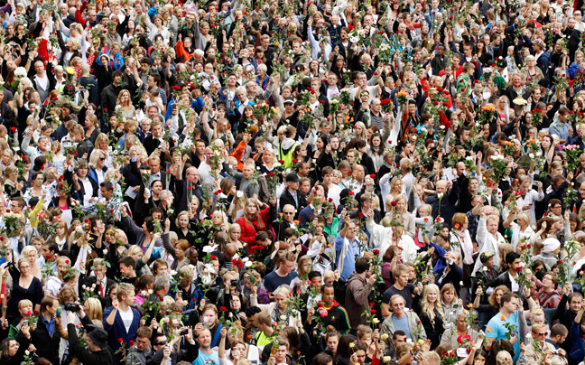 Κρατώντας λευκά ή κόκκινα τριαντάφυλλα, τουλάχιστον 100.000 άνθρωποι συγκεντρώθηκαν στο Όσλο χθες για να εκφράσουν τη θλίψη τους για τα θύματα των επιθέσεων της Παρασκευής, από τις οποίες έχασαν τη ζωή τους 76 άνθρωποι.