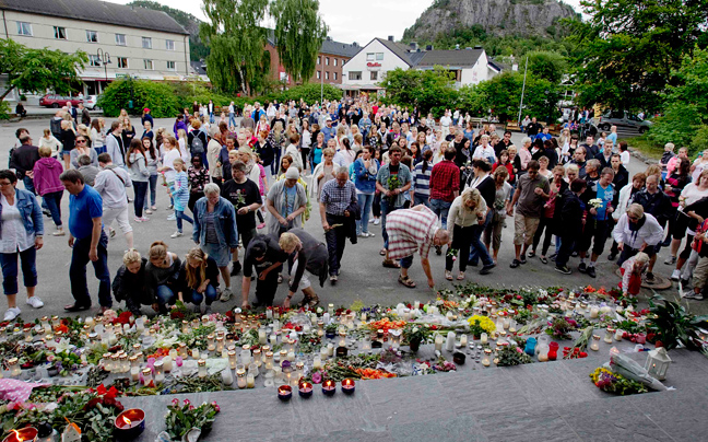 «Απόψε οι δρόμοι είναι γεμάτοι με αγάπη», δήλωσε ο διάδοχος του θρόνου πρίγκιπας Χάακον στο πλήθος, που συγκεντρώθηκε για να σηματοδοτήσει την αντίθεση του στη βομβιστική επίθεση και το μακελειό της Παρασκευής.