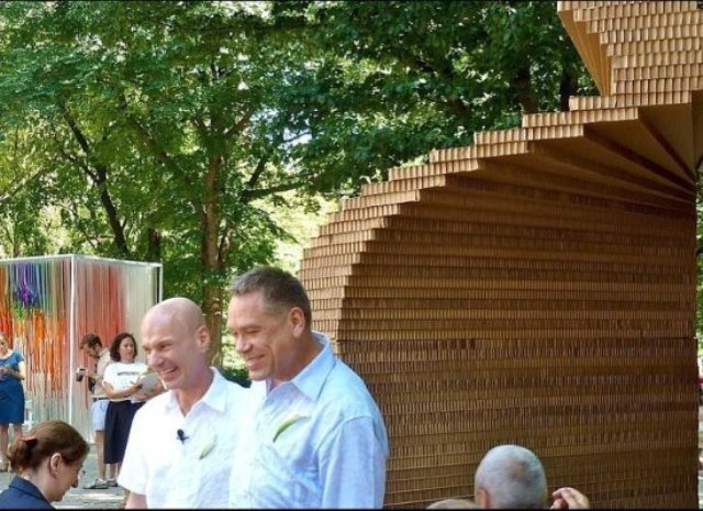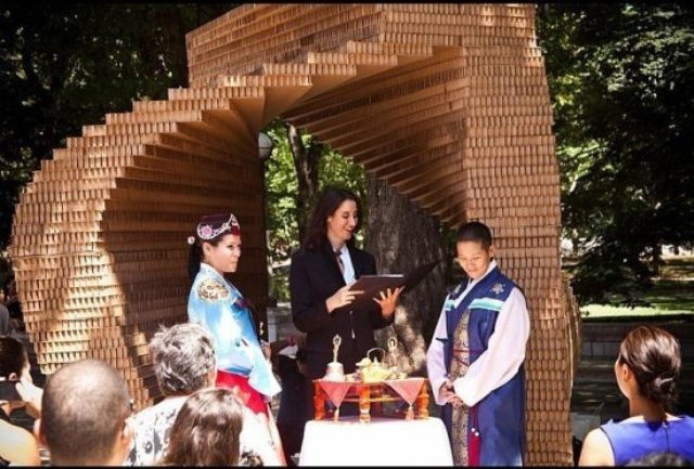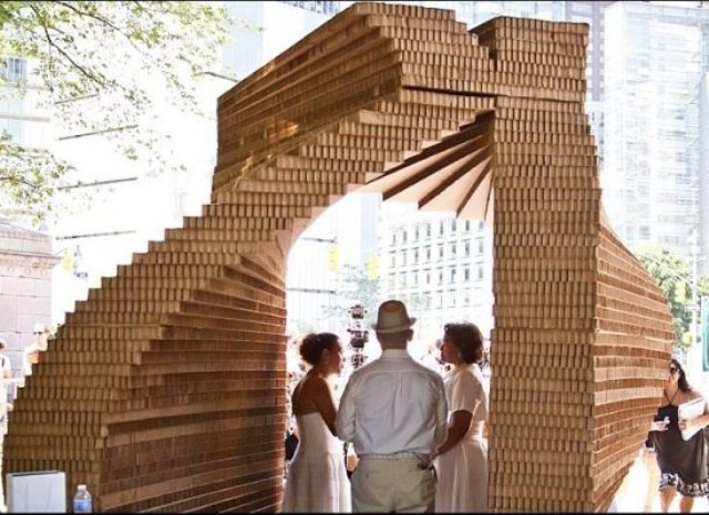 Έτσι επέλεξαν μια εταιρεία η οποία τους έφτιαξε ένα εντυπωσιακό σκηνικό από οικολογικές χάρτινες καμάρες, που στήθηκαν στο Central Park και αντικατέστησαν το τυπικό εκκλησάκι!