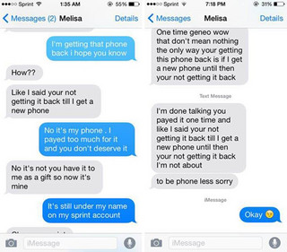 Αρχικά, σύμφωνα με το δημοσίευμα της Mirror, ζήτησε αυτοπροσώπως από την κοπέλα να του επιστρέψει το κινητό που της είχε αγοράσει καθώς ήταν δικό του. Εκείνη αρνήθηκε λέγοντάς του ότι δεν πρόκειται να μείνει χωρίς κινητό και θα του το έδινε μόνο όταν θα έπαιρνε ένα καινούριο. Ακολούθησε ανταλλαγή μηνυμάτων στα οποία από τη μία ο νεαρός ζητούσε τη συσκευή πίσω, καθώς την είχε πληρώσει ακριβά και δεν το άξιζε και εκείνη του έλεγε ότι της το έκανε δώρο και δεν επρόκειτο να το επιστρέψει.