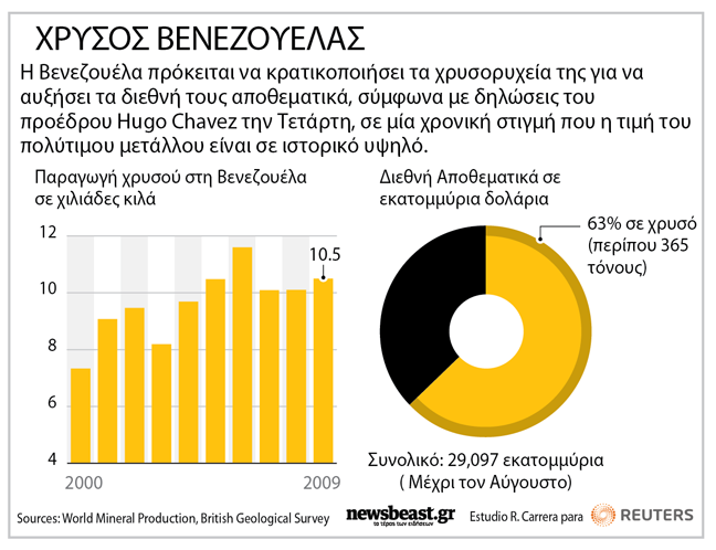 Ο πρόεδρος της Βενεζουέλας Ούγκο Τσάβες ανακοίνωσε ότι σχεδιάζει να εθνικοποιήσει όλες τις επιχειρήσεις που δραστηριοποιούνται στον τομέα του χρυσού, τόσο τα χρυσορυχεία όσο και τις εταιρίες επεξεργασίας, καθώς και ότι πρόκειται να ενισχύσει τα αποθέματα της χώρας.