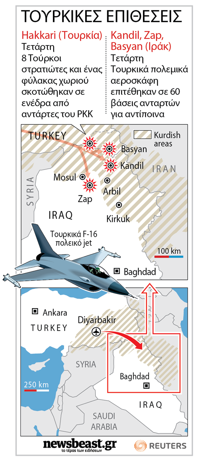 Το τουρκικό πυροβολικό έπληξε 168 στόχους στην περιοχή πριν από την επιχείρηση από αέρος, η οποία διεξήχθη σε αντίποινα για την ενέδρα που έστησαν αντάρτες του Κουρδικού Αυτονομιστικού Κόμματος (ΡΚΚ) σε στρατιωτική αυτοκινητοπομπή στη νοτιοανατολική Τουρκία σκοτώνοντας 12 μέλη των υπηρεσιών ασφαλείας.