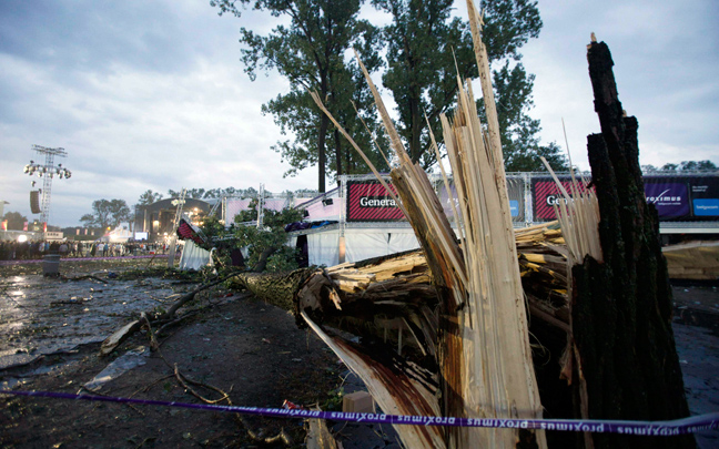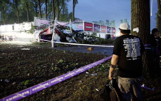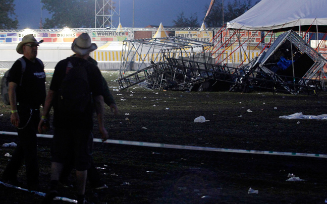 Το δυστύχημα έγινε όταν θυελλώδεις άνεμοι και σφοδρή βροχόπτωση ξερίζωσαν δέντρα, έριξαν σκηνές και ξεκόλλησαν τη σκεπή γκρεμίζοντας τις γιγαντοοθόνες.