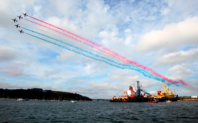Μία ακόμη τέτοια είχε καθηλώσει μερικές μέρες νωρίτερα και τους θεατές στο Falmouth, Cornwall της Βρετανίας, όπου οι Red Arrows εμφανίζονται κάθε χρόνο.