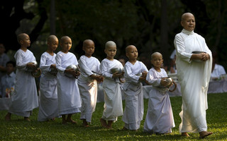 Βουδίστρια καλόγρια στην Ταϊλάνδη καθοδηγεί τις μικρές εκπαιδευόμενες μοναχές κατά τη διάρκεια του φεστιβάλ Songkran στο κέντρο διαλογισμού Sathira-Dhammasathan στην Μπανγκόκ.