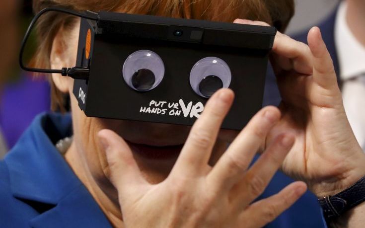 Οι δύο ηγέτες βρέθηκαν στη διεθνή βιομηχανική έκθεση στο Ανόβερο και εκεί ο φακός του Reuters τους κατέγραψε ενώ δοκίμαζαν τα γυαλιά εικονικής πραγματικότητας.