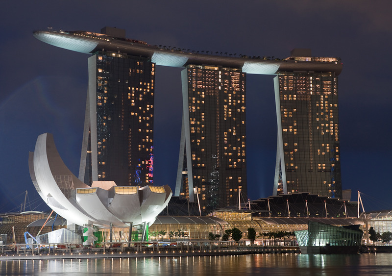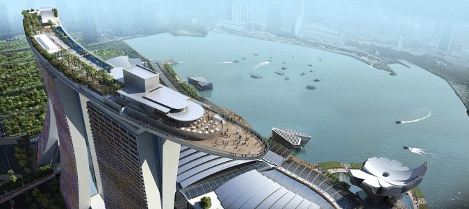 Κατασκευασμένο από μία εταιρία του Λας Βέγκας, το Marina Bay Sands, διαθέτει 2.561 δωμάτια και ένα τεράστιο καζίνο το οποίο μάλιστα κοστολογείται ως το πλέον ακριβό του κόσμου! Το Marina Bay Sands, στην πραγματικότητα αποτελείται από ένα συγκρότημα κτιρίων, στα οποία περιλαμβάνονται οι τρεις ουρανοξύστες, όπου βρίσκονται τα δωμάτια, και τέσσερα μικρότερα σε ύψος κτίρια που στεγάζουν πολυκαταστήματα, θέατρο, το καζίνο καθώς και ένα μουσείο τεχνών και επιστημών.