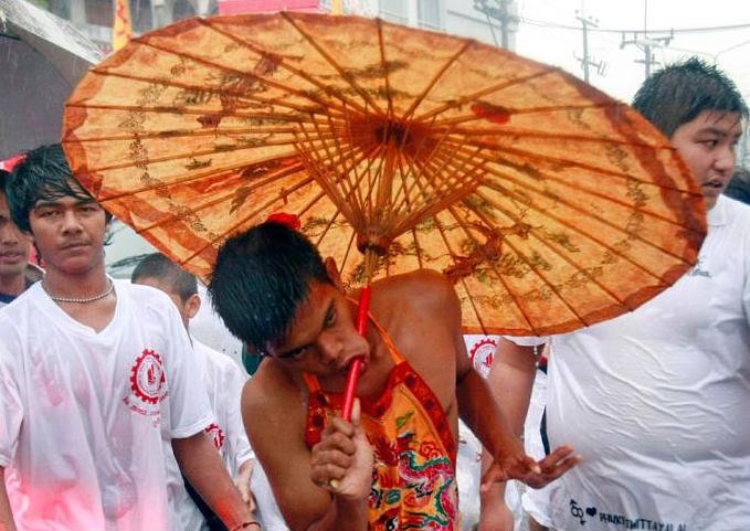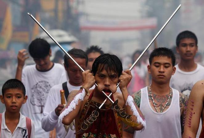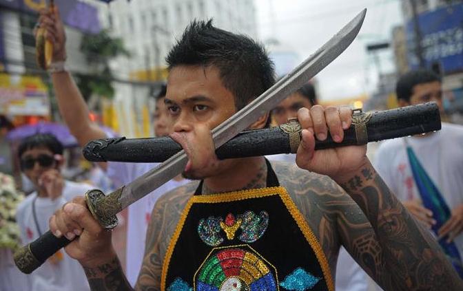 Ένας πιστός περπατά στους δρόμους του Πουκέτ στην Ταϊλάνδη έχοντας περάσει από το μάγουλό του ένα σπαθί, ως ένδειξη σεβασμού και για να εξαγνίσει την ψυχή του.