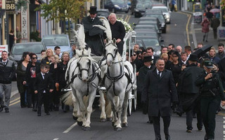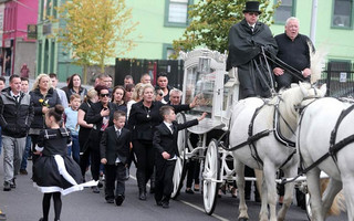 Λευκή άμαξα με τέσσερα λευκά άλογα μετέφερε το φέρετρο της Crumlish συνοδευόμενο από δέκα μαύρες λιμουζίνες στις οποίες επέβαιναν η οικογένεια και φίλοι της.